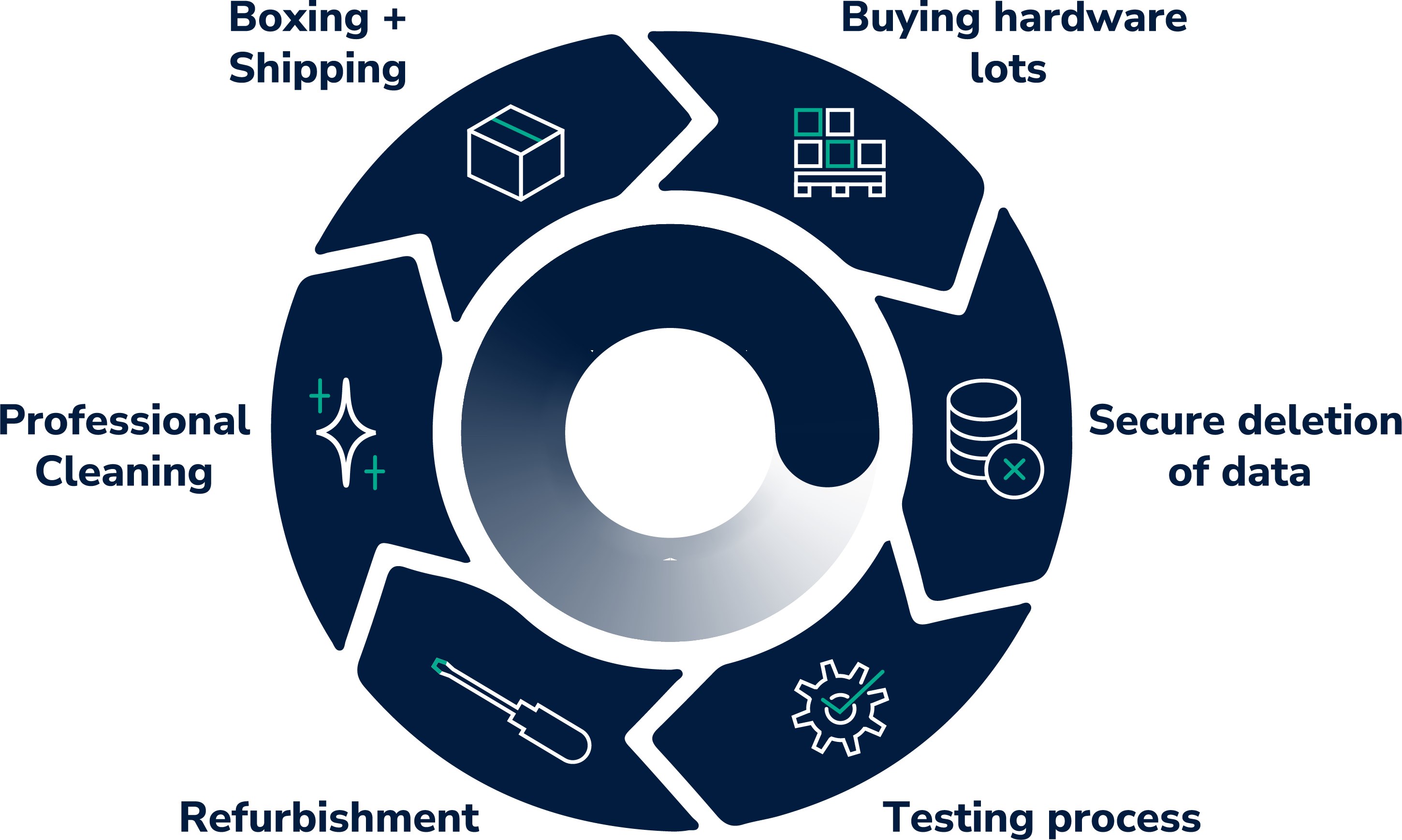 Your hardware will get a second life with us through refurbishment, whereby the devices are cleaned, possibly repaired and of course deleted any data 100% securely.